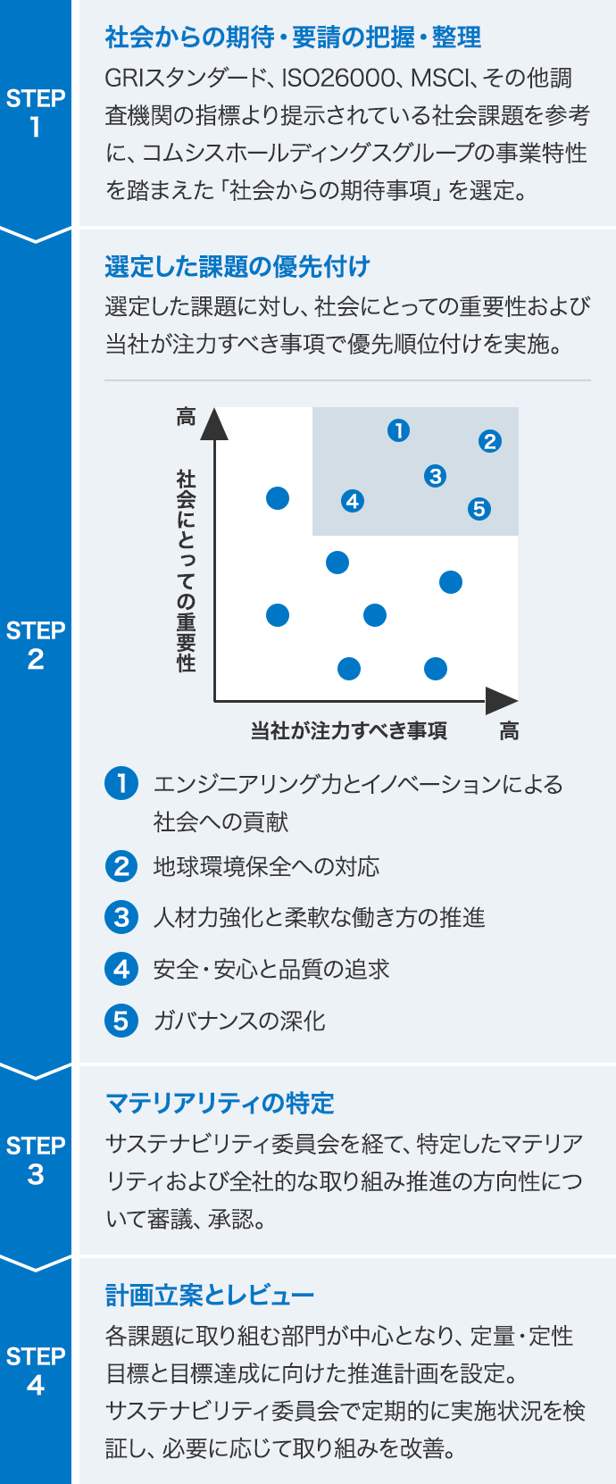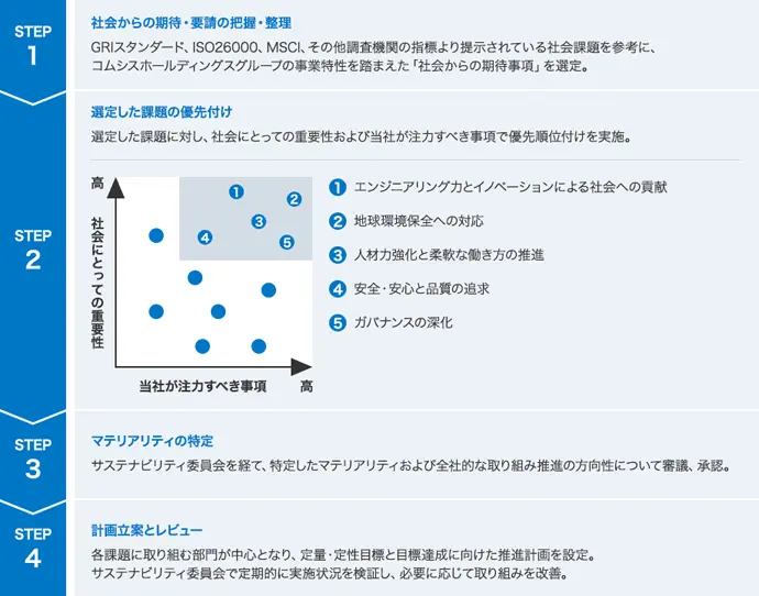 コムシスグループでは、社会にとって重要であると同時に、当社が注力すべき課題として、5つのマテリアリティ(重要課題)を特定しています。事業環境や社会情勢を踏まえつつ、定期的に見直しを行っています。